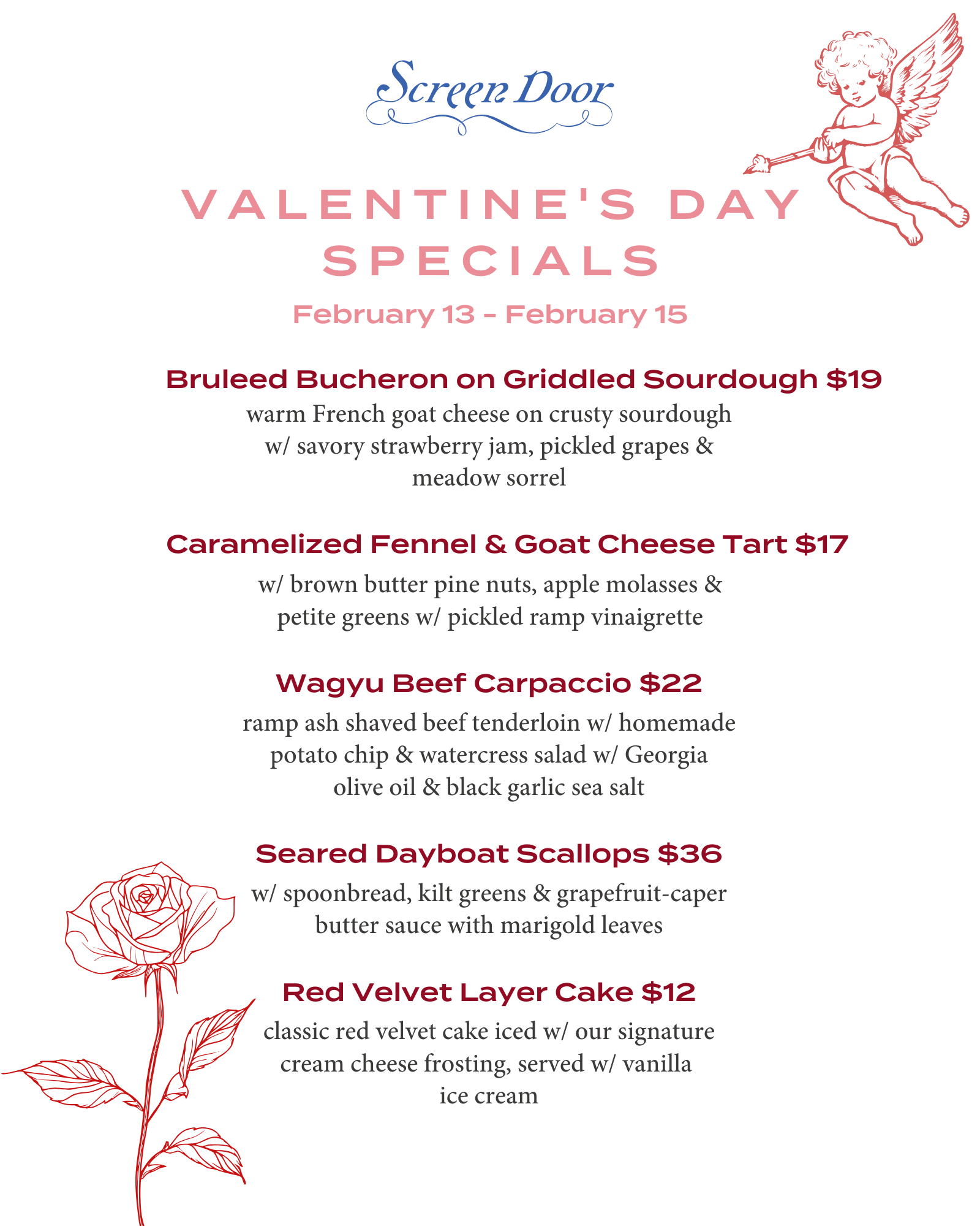 Celebrate love with caramelized fennel & goat cheese tart, wagyu beef carpaccio, seared scallops, and bruleed bucheron on griddled sourdough.
