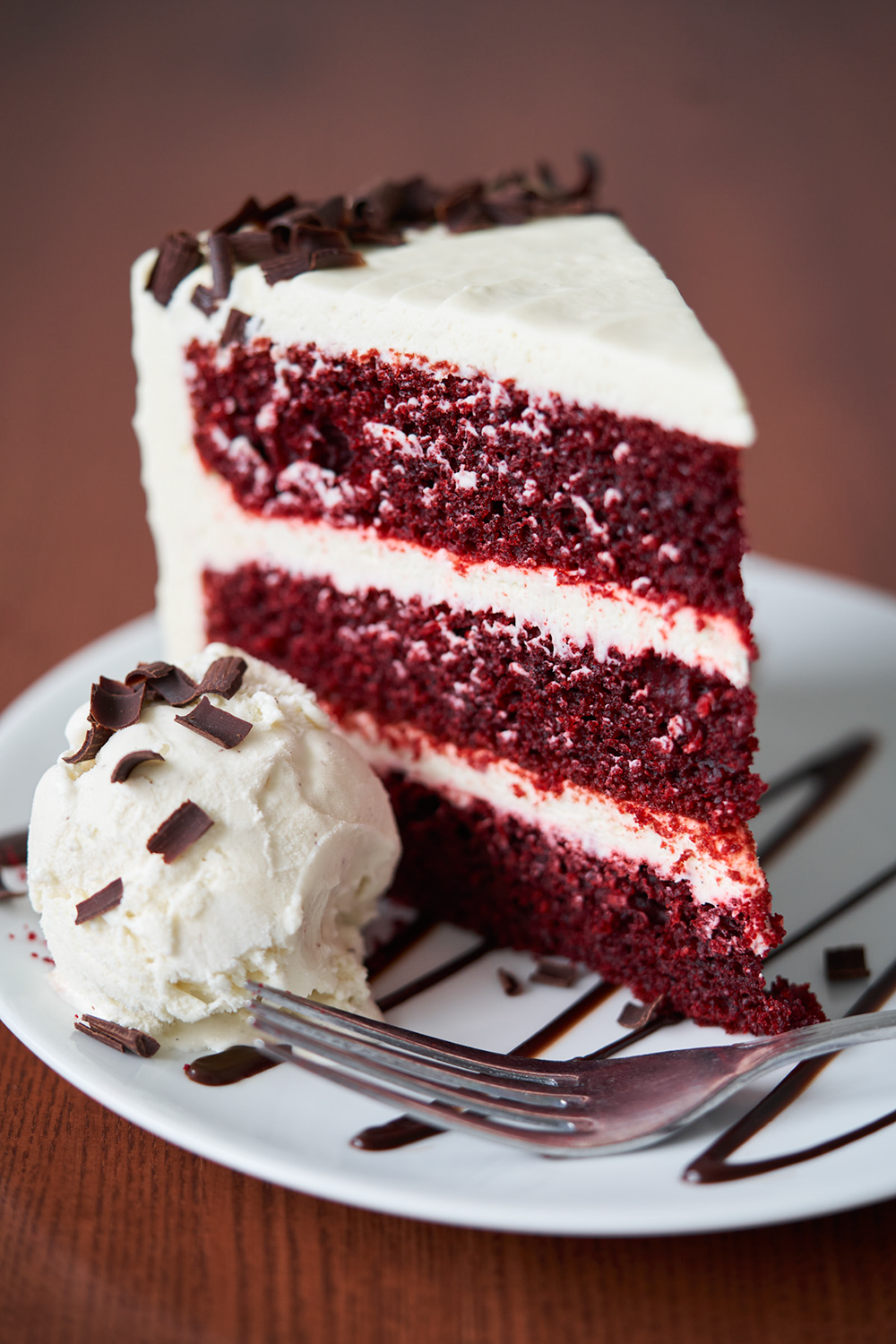 Donβt forget to save room for dessert! Indulge in a slice of our three-layer red velvet cocoa cake with cream cheese frosting at your table.