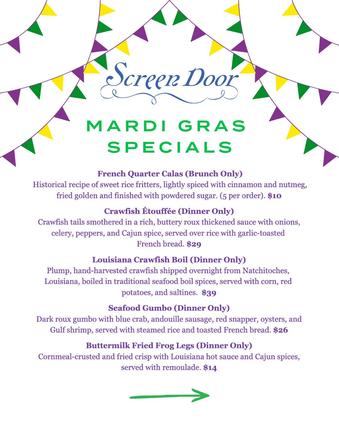 Celebrate Mardi Gras at Screen Door with a special Fat Tuesday menu inspired by the flavors of South Louisiana. Chef Dominic Finzo will be serving up New Orleans classics all day, with select dishes during both brunch and dinner.